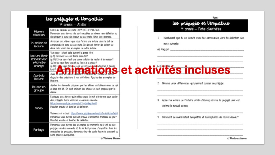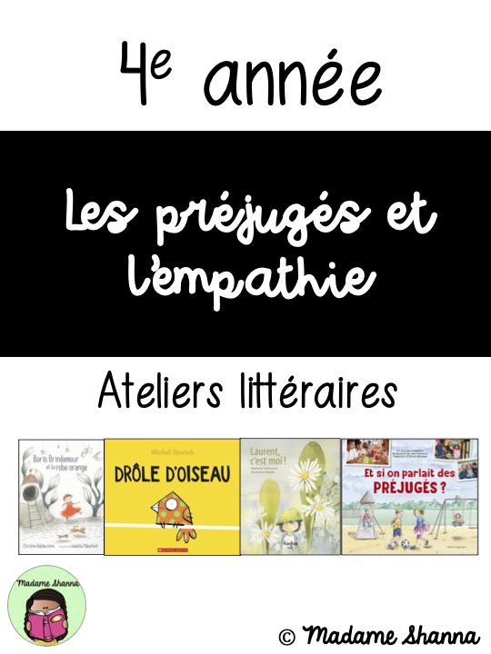 Avec ce document, vous pourrez travailler 3 périodes avec des livres de littérature jeunesse sur les préjugés et l'empathie avec des 4e année. Cet atelier peut aussi se vivre en 3e année ou en 5e année. Tout est disponible dans le document pour animer les périodes et avoir des traces de votre travail. Il vous reste à vous procurer les livres.