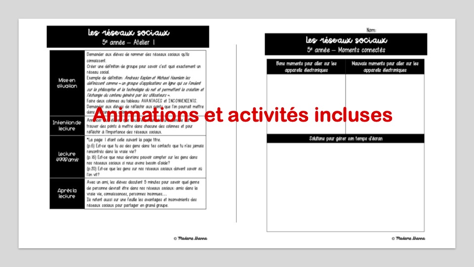 Avec ce document, vous pourrez travailler 3 périodes avec des livres de littérature jeunesse sur les réseaux sociaux avec des 5e année. Cet atelier peut aussi se vivre en 4e année ou en 6e année. Tout est disponible dans le document pour animer les périodes et avoir des traces de votre travail. Il vous reste à vous procurer les livres.